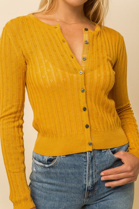 Soft and lightweight pointelle cotton knit fabric with subtle openwork, our Amber sweater is a 55% acrylic, 45% cotton round neck button down cardigan. Pair with our Allie Rose skirt for an easy breezy fun outfit.