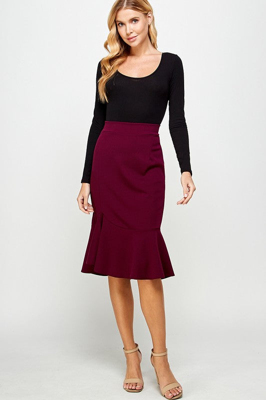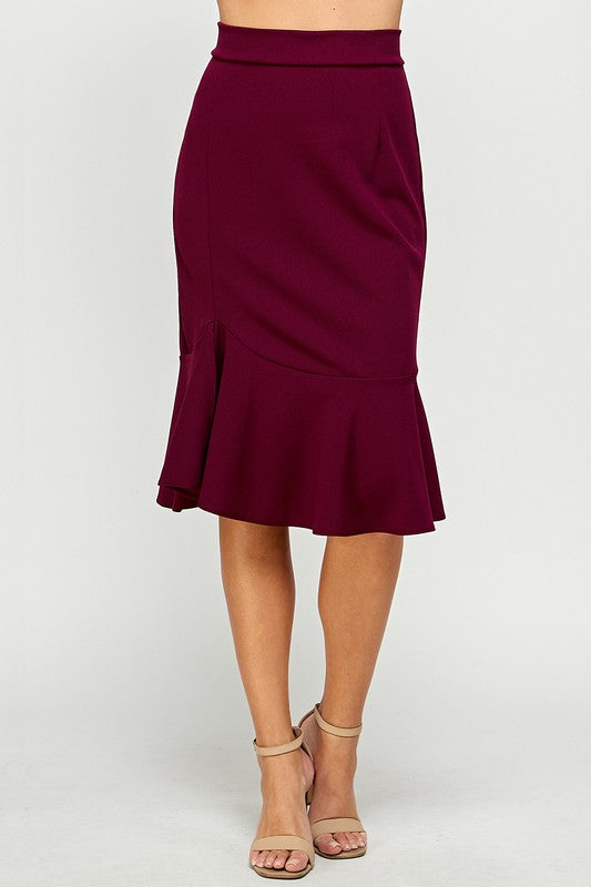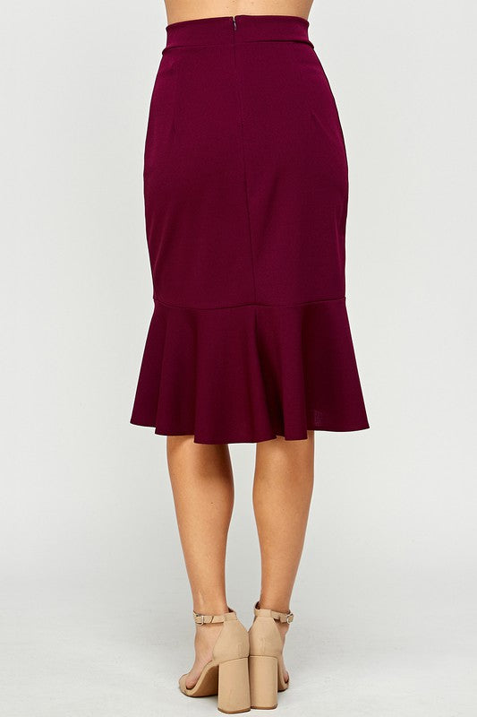 Solid mermaid midi skirt, perfect length and fit for an office setting. Featuring fluted peplum hem with slit as well as front and back darts and invisible back zipper closure. Our Esther skirt is made of solid techno crepe fabric that provides good stretch to keep your comfortable all day long.