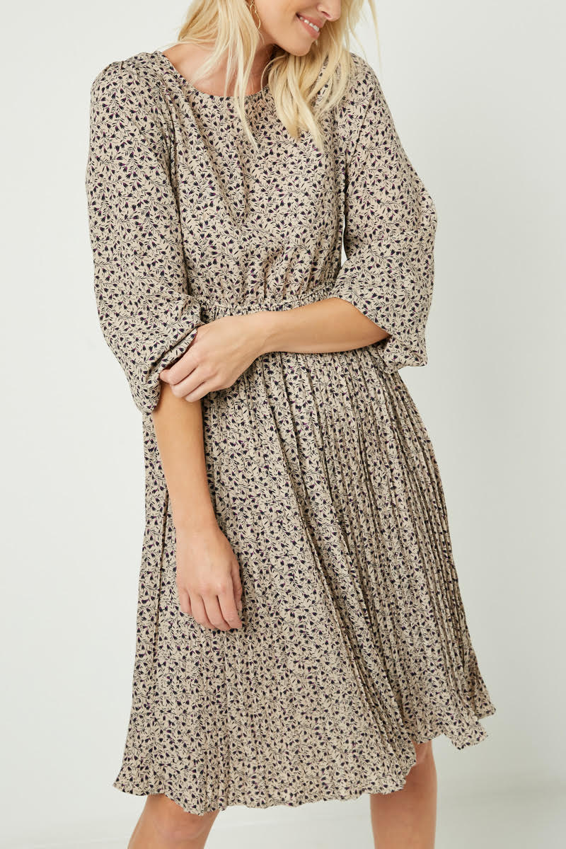 From desk to dinner, this versatile dress easily transitions from work to dinner with your girlfriends! Our Hayden dress is a ditsy print pleated skirt midi dress that you’ll want to slip on for any occasion! Dress features a round-cut neckline, puff sleeves, fitted stretch waistline, pleated silhouette and back keyhole closure.
