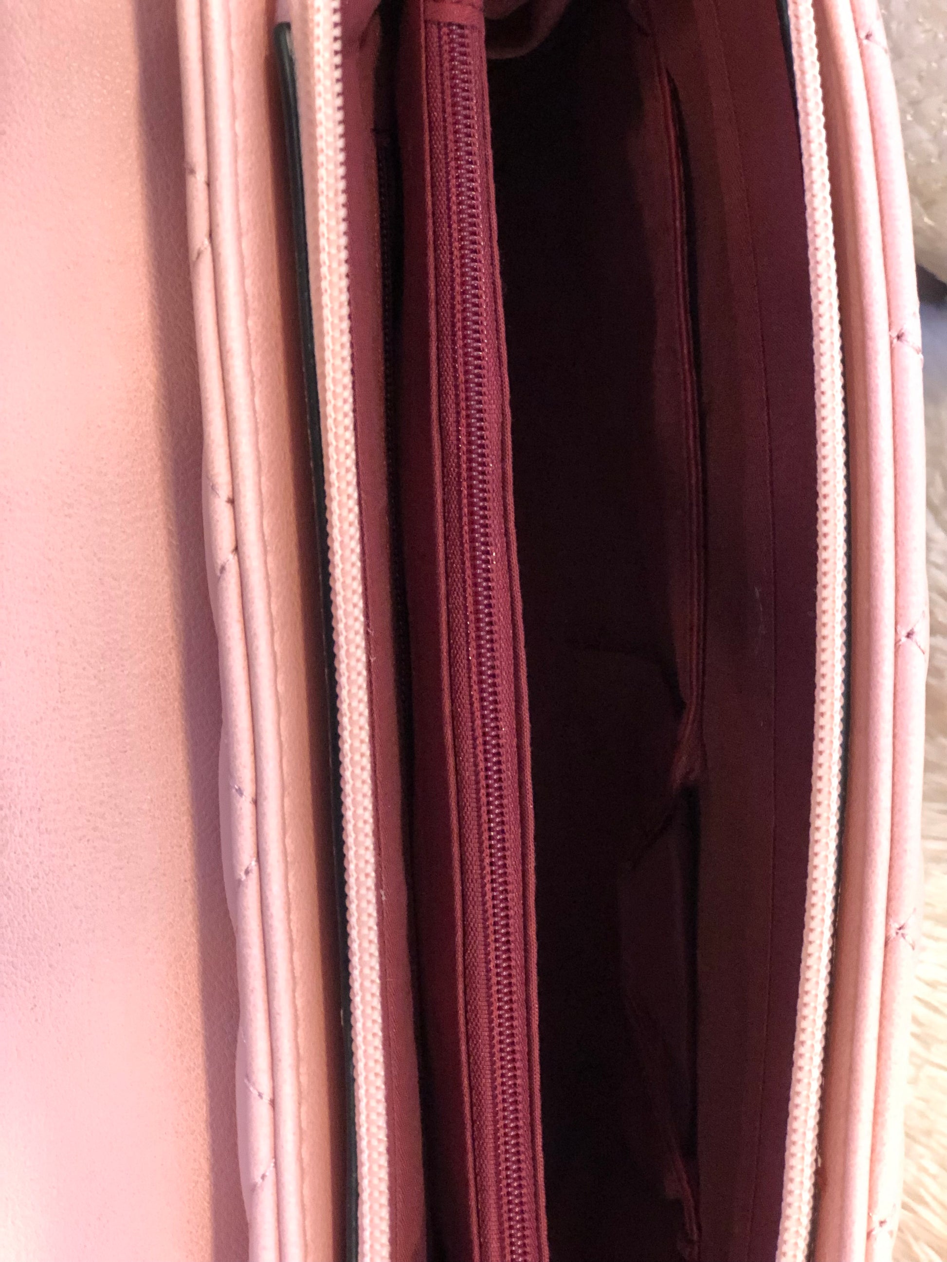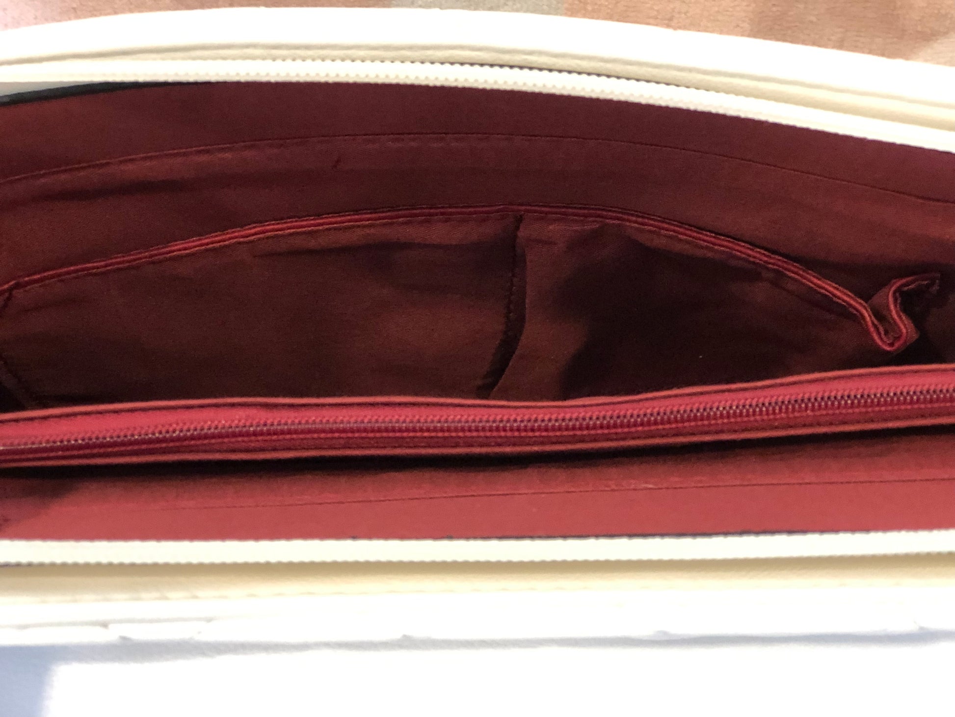 - Spacious fully lined red fabric interior with additional inside pockets and two zipper compartments