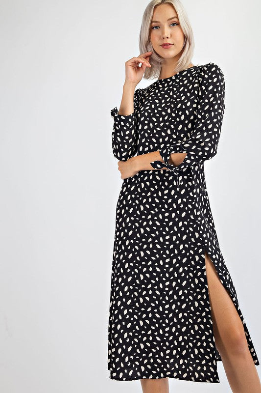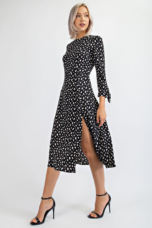 Simple yet fierce our Julie McCoy midi dress is the epitome of understated casual elegance. It features a round neckline, side slit, ¾ tie sleeves with keyhole button and a hidden back zipper closure. This versatile classic can be worn in a professional work setting, a fun and relaxing vacation trip, a day out with friends or on that perfect date!