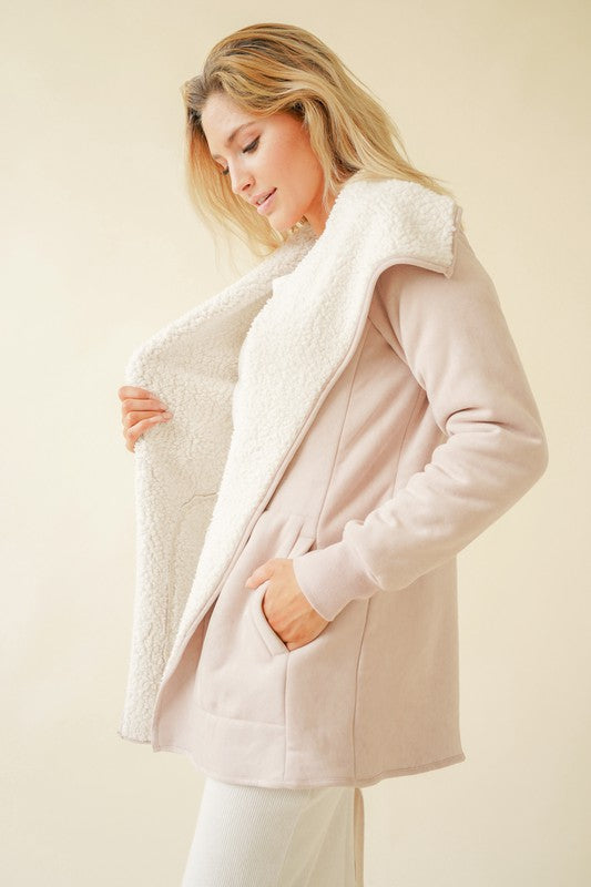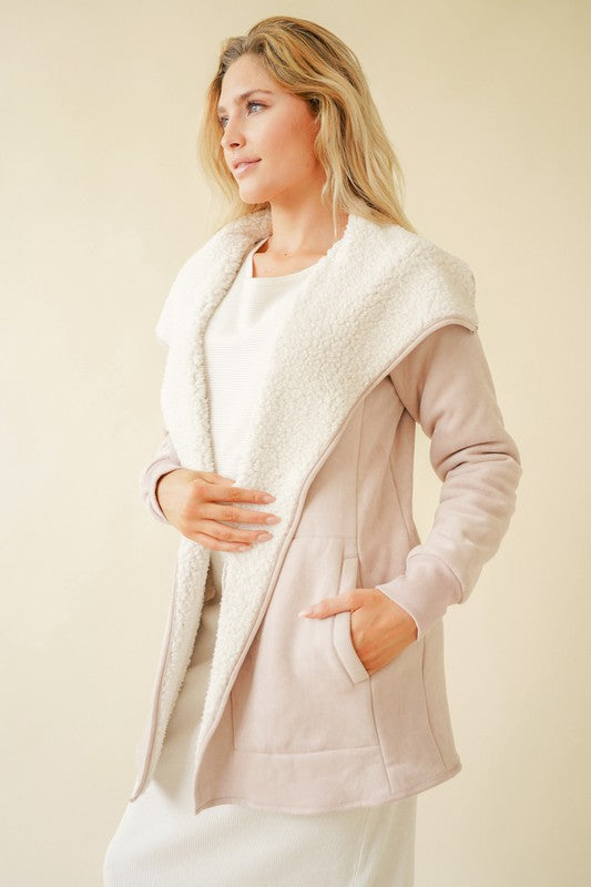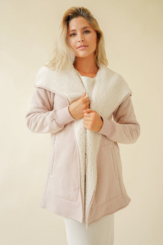 Soft and feminine, our Keira Rose open cardigan jacket resembles the rose it is named after and maintains the gloriously romantic yet playful aesthetic. This suede sherpa lined open cardigan jacket will wrap you in warmth as the sweet blush pink and cream coloration will add the perfect modern touch and eclectic edge to any winter outfit. This open cardigan jacket with pockets will be a must have for your winter wardrobe!